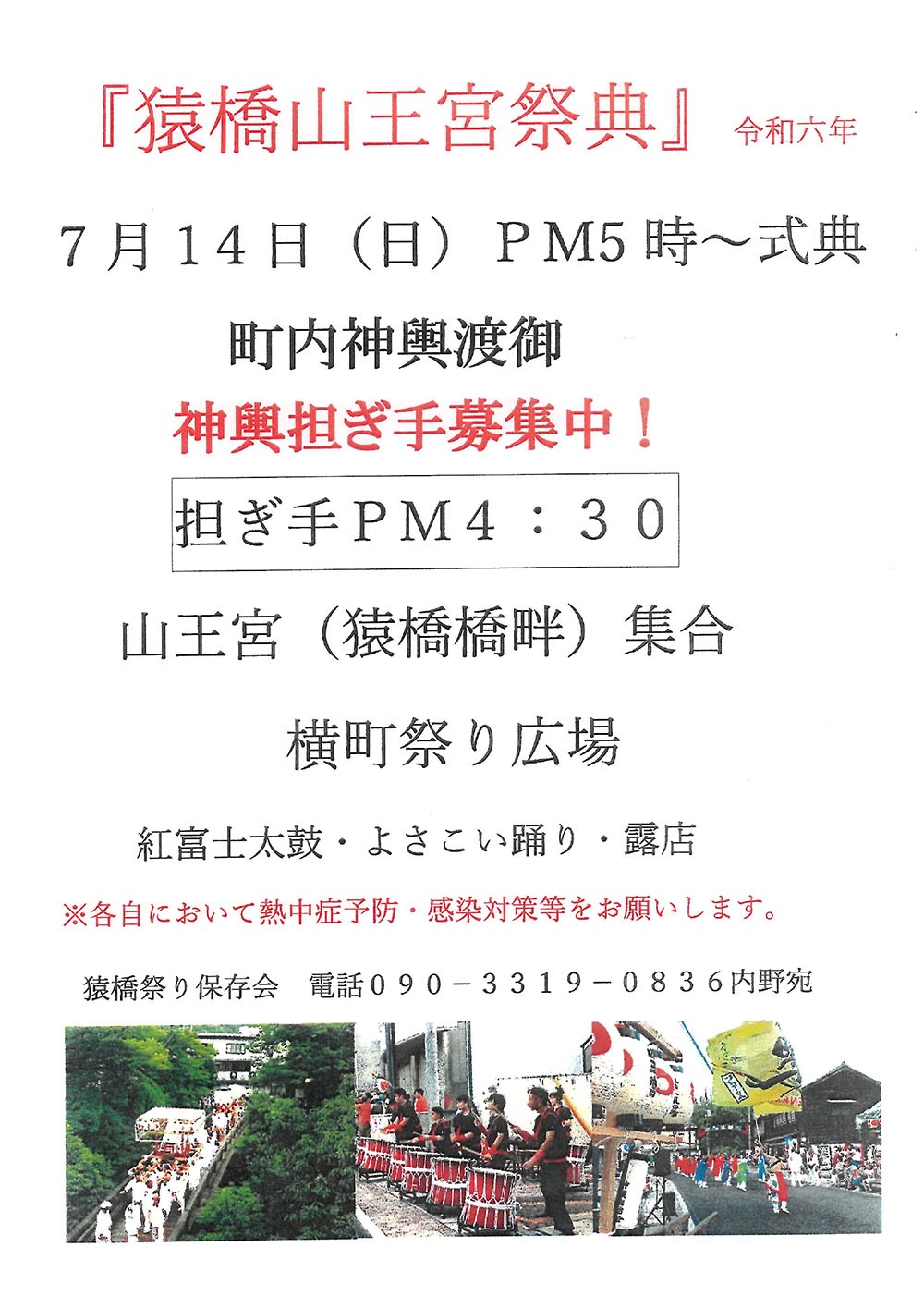 7月14日の日曜日に、猿橋山王宮のお祭りが行われます。