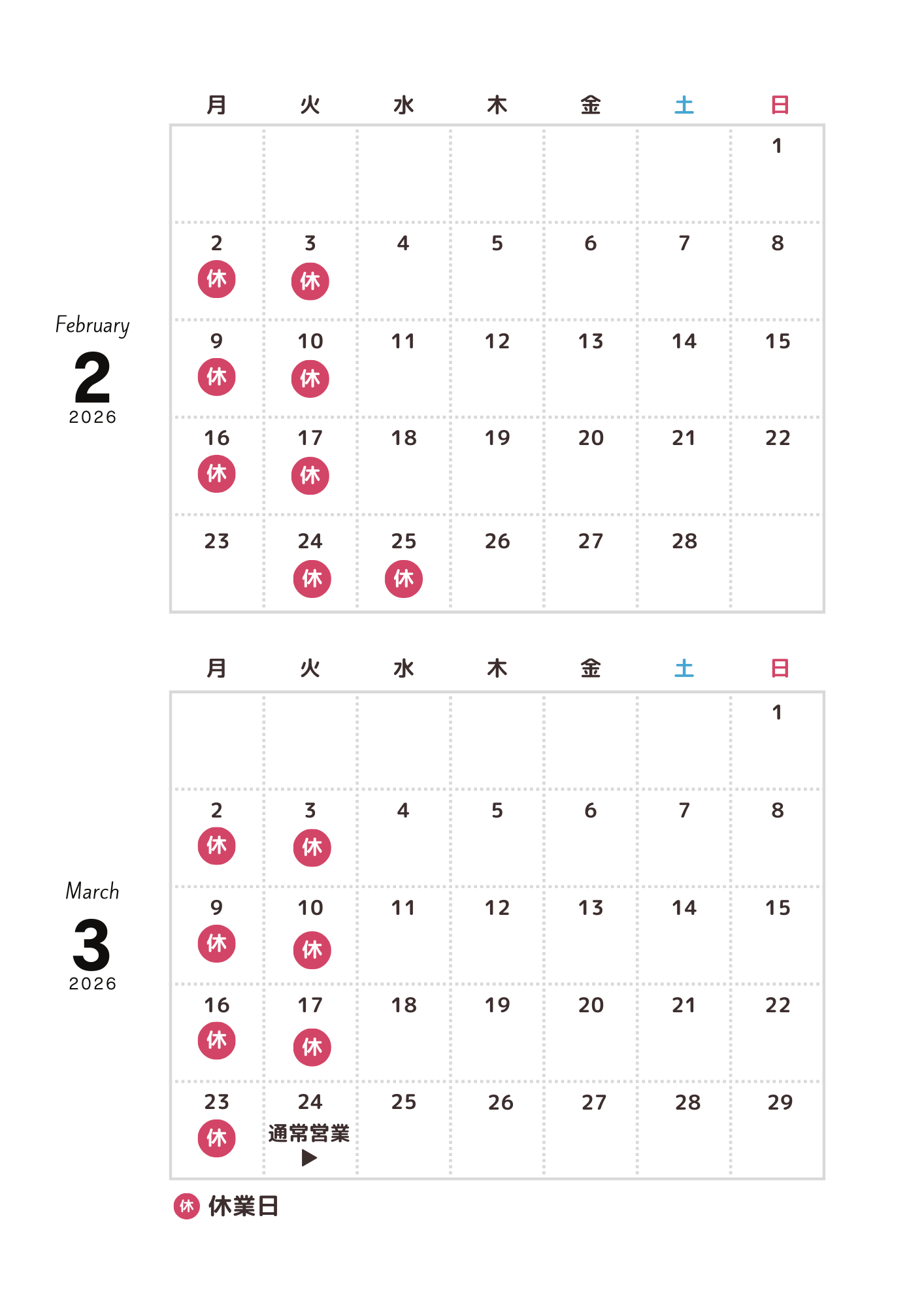 (1.2.3月は閑散期のため変則的なお休みとなります。ご注意下さい )