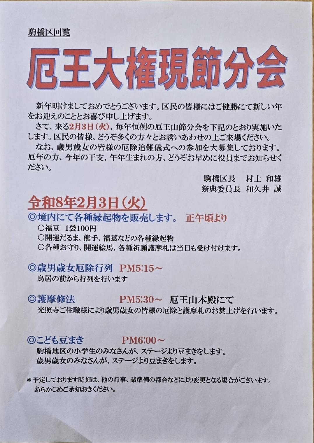 2026年2月3日(火)開催|駒橋「厄王大権現節分会」のお知らせ