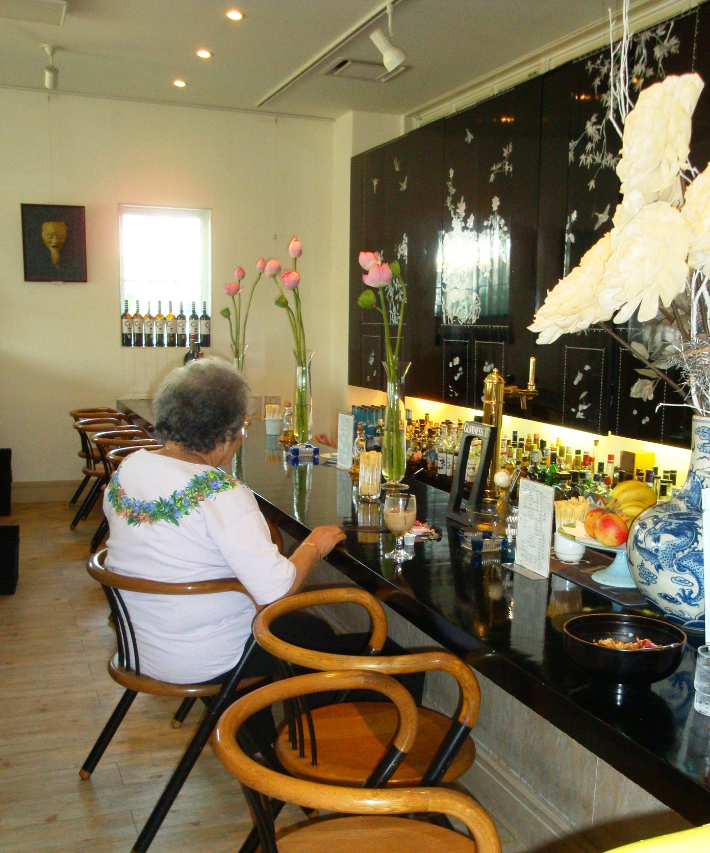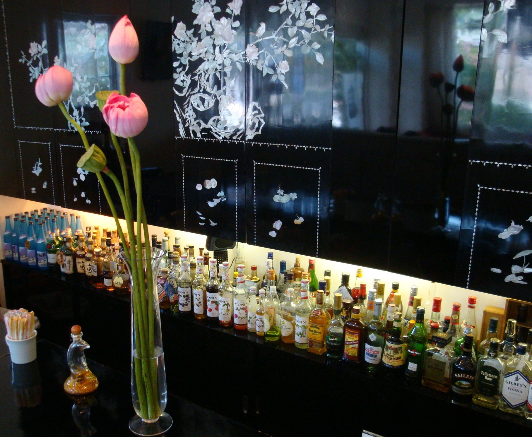 沢山の種類のお酒があります。 いつも素敵なお花が飾られています。