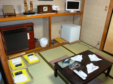 畳に布団を引いたお部屋は落ち着きますね。 部屋にはTV・冷蔵庫・ポット・浴衣・タオルなど揃っています。