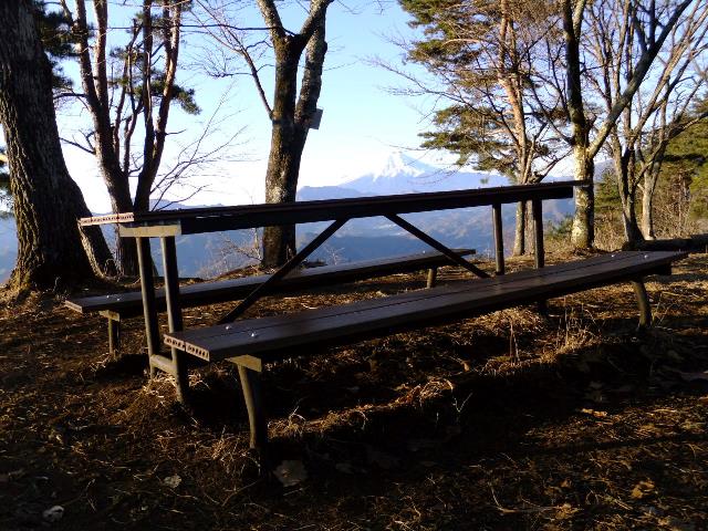 ピンク色に染まる富士山の美しい姿にただただ感動する思いです。この時期の富士山は最高ですね(^^) 広い山頂は綺麗に整備され、テーブル付きのベンチが設置されてありゆっくりっと休憩も出来ますね♪ベンチに座ってご覧のとおり富士山を眺める事が出来ます