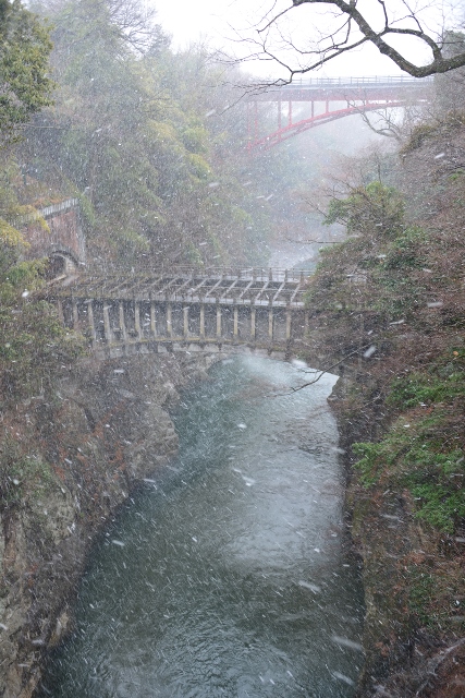 雪がしきりに降る中の、シーンと静まり返ったいつもと違った猿橋の景色と重要文化財の水路橋です。