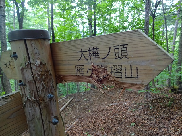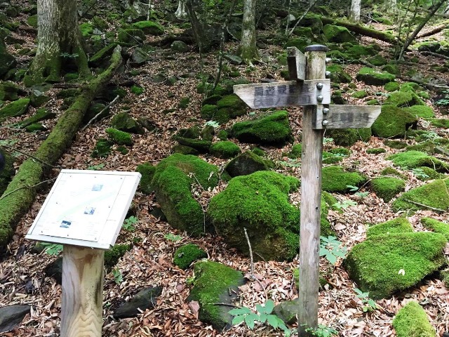 分岐地点に設置してある道標。 長沢分岐より沢沿い一帯がシオジの自生地帯