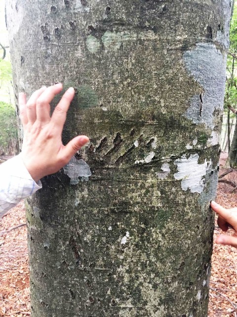この森には沢山の動物たちが住んでいます。 このブナの木はクマの爪痕!!
