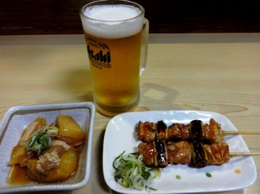 こちらは¥700お疲れ様メニュー。その日の煮物と焼き鳥2本と小ジョッキビール