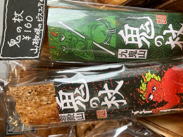 大月銘菓の厚焼木乃実煎餅の山椒の風味をサクサクのビスコッティに焼き上げた「鬼の杖」岩殿山の赤鬼と、九鬼山の青鬼。各160円