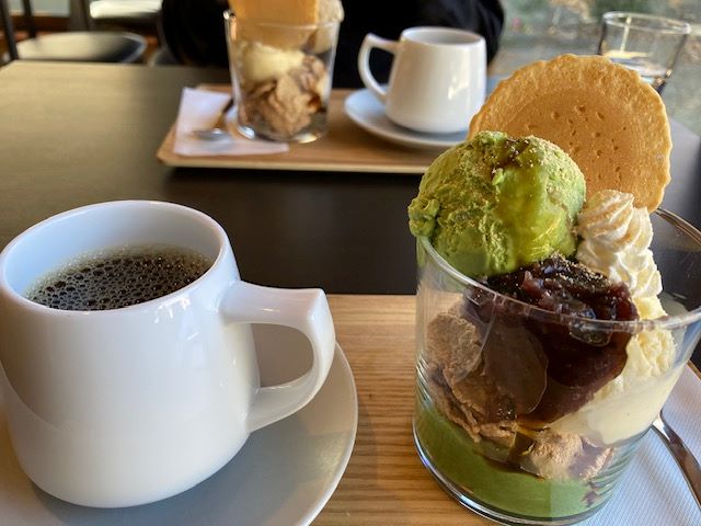 濃厚な抹茶のアイスクリームと抹茶のババロア・手作りあんこ「抹茶パフェ」とっても美味しくいただきました!!