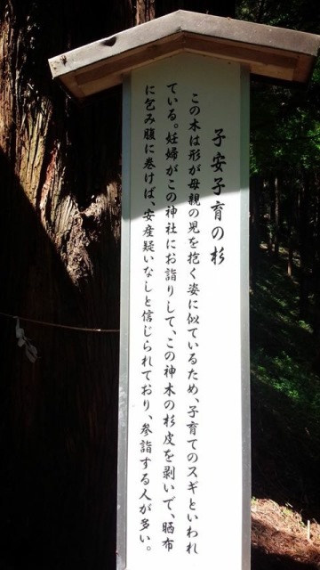 妊婦がこの神社にお参りをし、御神木の杉皮を剥いて晒し布に包み腹に巻けば