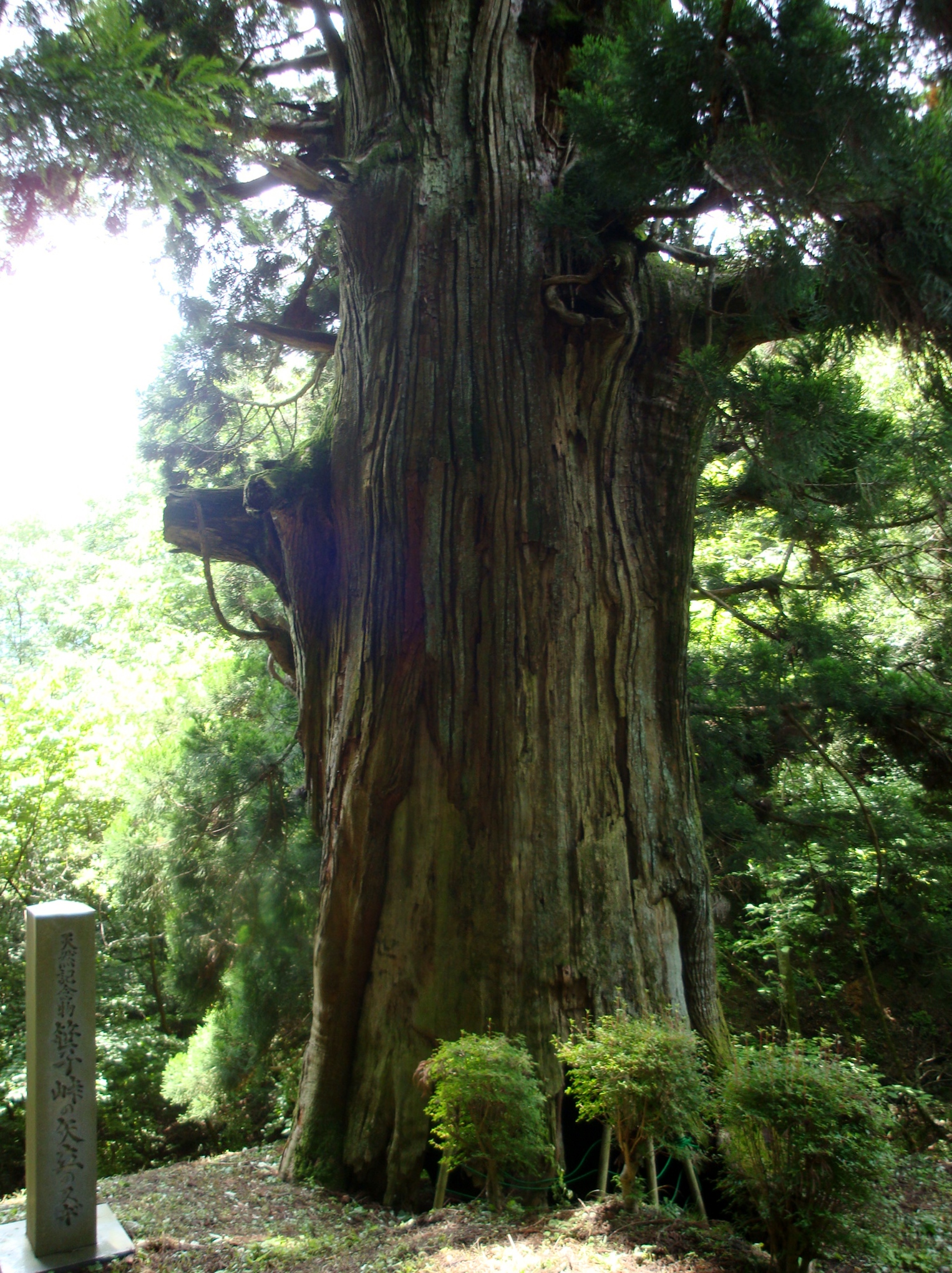峠の頂上から少し東へくだった沢沿いに立っている。樹高約28m、根廻り14.8m、目通幹囲9m、